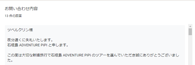 "ツベルクリン様 夜分遅くに失礼いたします。 石垣島 ADVENTURE PiPi と申します。 この度は大切な新婚旅行で石垣島 ADVENTURE PiPi のツアーを選んでいただき誠にありがとうございました。 私共のツアーをこのような形で記事に取り上げていたいたことに心よりお礼申し上げます。 フラットな視点から忌憚のないご感想をつづっていただいており、スタッフ一同、とてもうれしい気持ちで記事を拝読いたしました。"