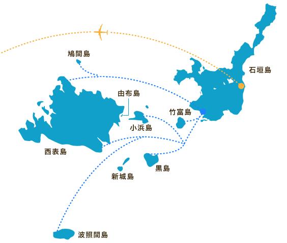 石垣港08:30発 ~( 船にて約40分) ~ 大原港(西表島)着― 仲間川ボート乗場 ... 仲間川マングローブクルーズ(約65分) ... 仲間川ボート乗場 ― (バスにて約30分) ― 美原 ...干潟を水牛車にて約15分... 由布島(昼食・フリータイム)... 干潟を水牛車にて約15分... 美原 ―(バスにて約30分)― 大原港14:00発 ~ 船にて約40分 ~ 小浜港(小浜島)着 ―マイクロバスにて島内観光(約30分)― 小浜港15:25発 ~ 船にて約30分 ~ 竹富港(竹富島)着 ― 島内マイクロバス観光(星砂の浜など)― 竹富港16:50発~( 船にて約15分 )~ 石垣港17:05頃到着